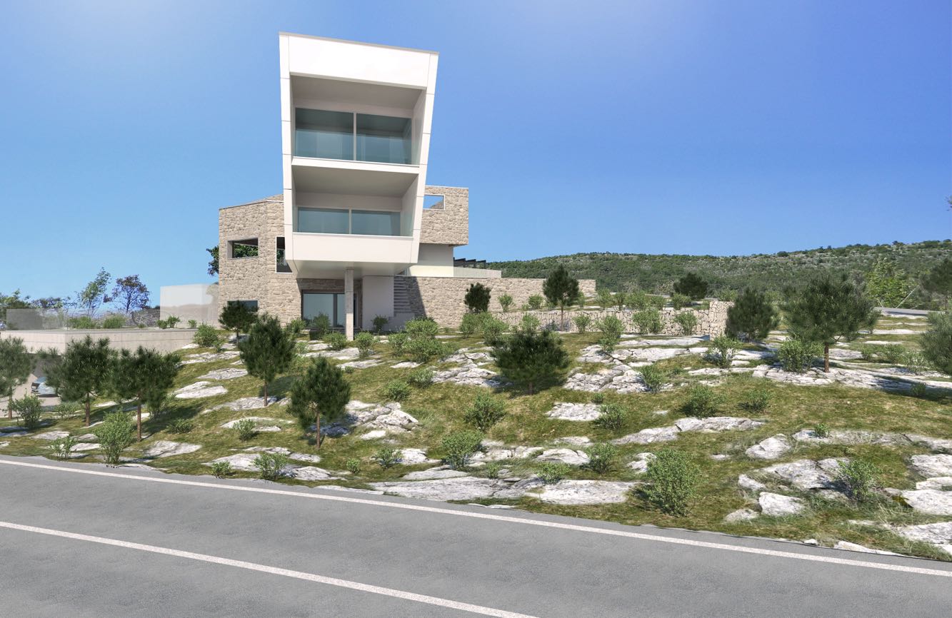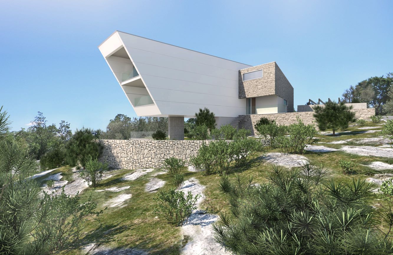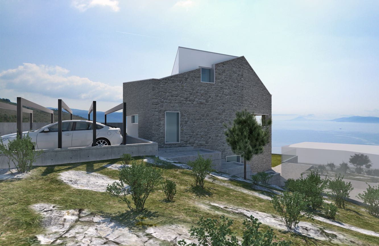 Iz konteksta same lokacije nastaje kuća sa jasnim volumenom uperenim u pogled, istovremeno dijelom obavijen snažnim kamenim volumenom koji kontekstualizira te omekšava uperenu konzolu volumena.